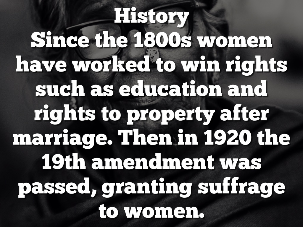 Since the 1800s women have worked to win rights such as education and rights to property after marriage. Then in 1920 the 19th amendment was passed, granting suffrage to women.