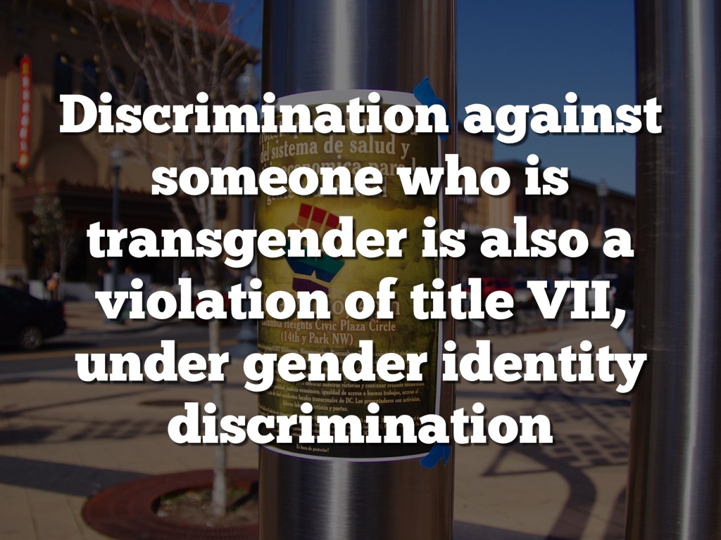 Discrimination against someone who is transgender is also a violation of title VII, under gender identity discrimination