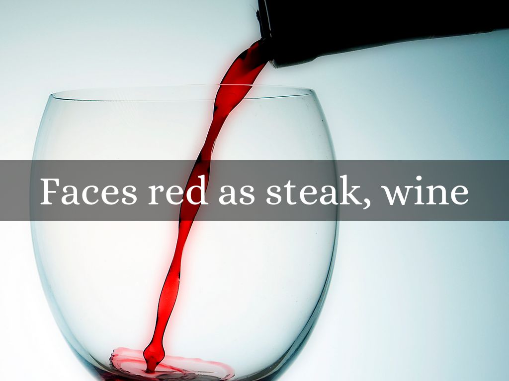 Faces red as steak, wine