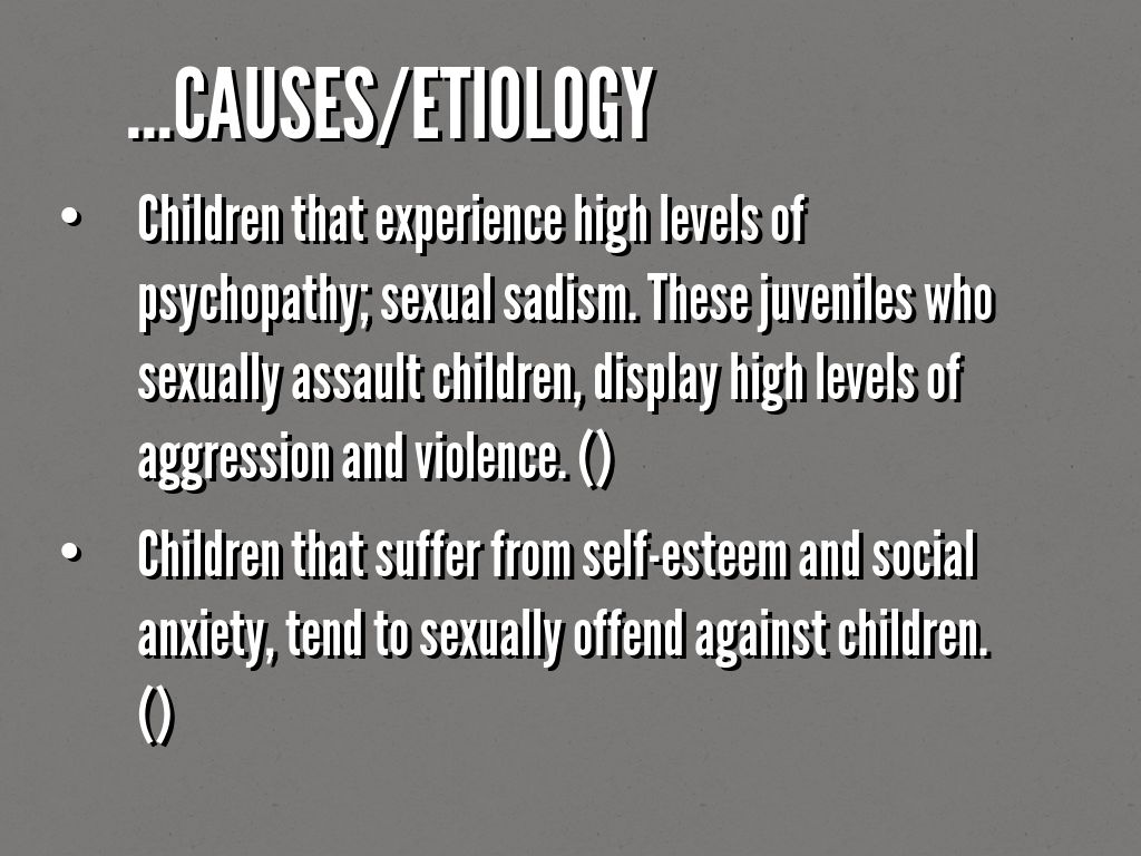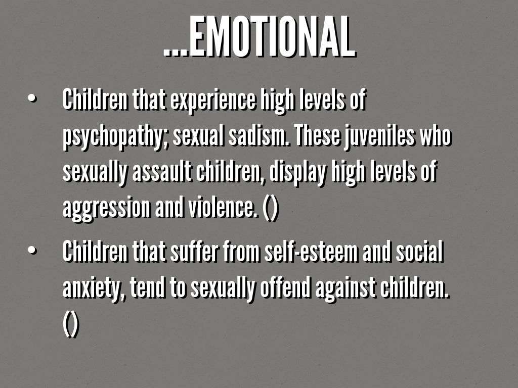 Children that experience high levels of psychopathy; sexual sadism. These juveniles who sexually assault children, display high levels of aggression and violence. ()