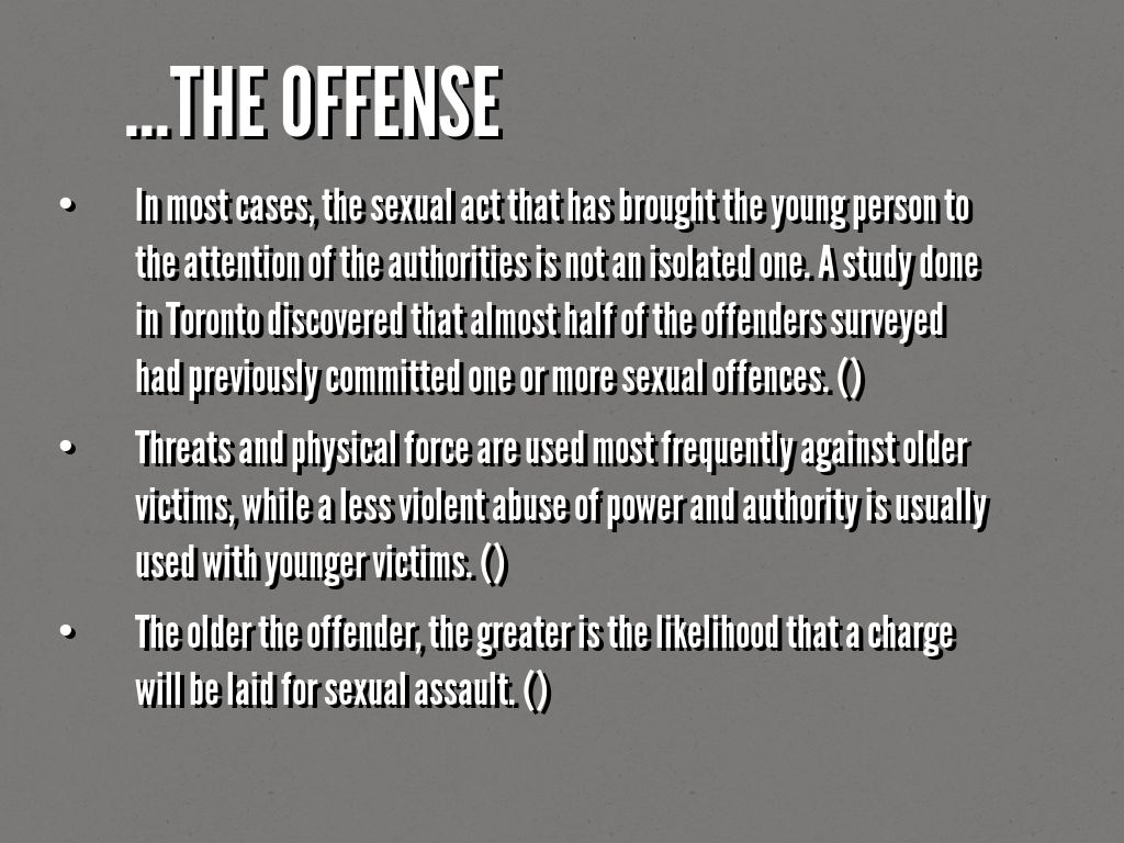 In most cases, the sexual act that has brought the young person to the attention of the authorities is not an isolated one. A study done in Toronto discovered that almost half of the offenders surveyed had previously committed one or more sexual offences. ()