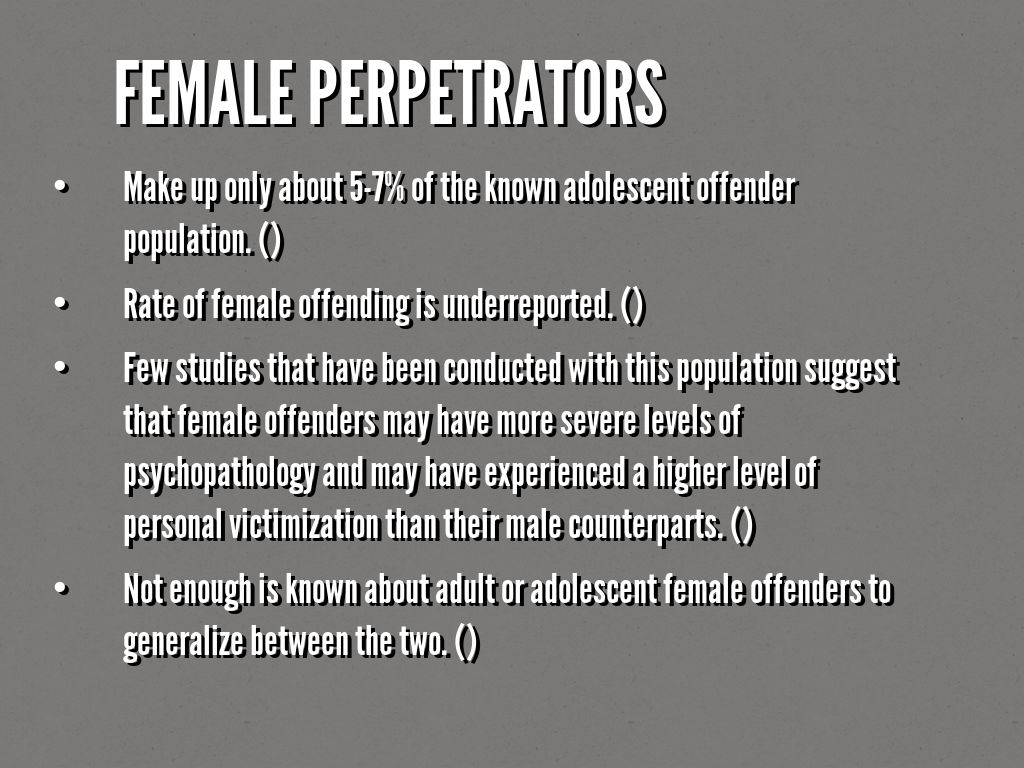 Few studies that have been conducted with this population suggest that female offenders may have more severe levels of psychopathology and may have experienced a higher level of personal victimization than their male counterparts. ()