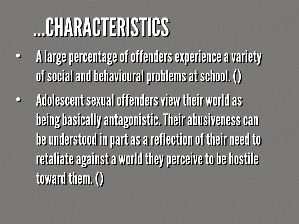 Adolescent sexual offenders view their world as being basically antagonistic. Their abusiveness can be understood in part as a reflection of their need to retaliate against a world they perceive to be hostile toward them. ()