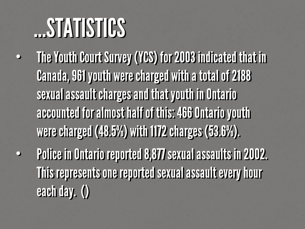 The Youth Court Survey (YCS) for 2003 indicated that in Canada, 961 youth were charged with a total of 2188 sexual assault charges and that youth in Ontario accounted for almost half of this: 466 Ontario youth were charged (48.5%) with 1172 charges (53.6%).