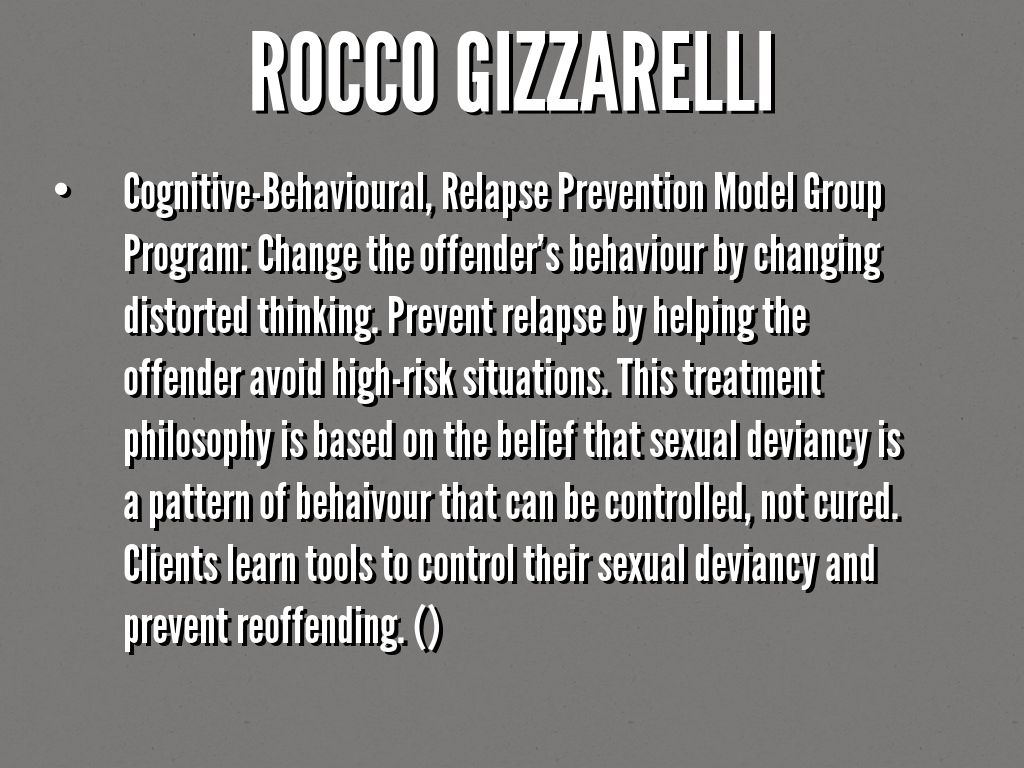 Cognitive-Behavioural, Relapse Prevention Model Group Program: Change the offender’s behaviour by changing distorted thinking. Prevent relapse by helping the offender avoid high-risk situations. This treatment philosophy is based on the belief that sexual deviancy is a pattern of behaivour that can be controlled, not cured.