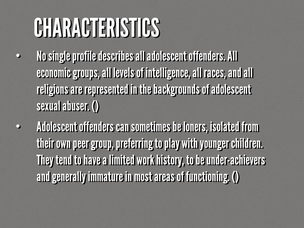 No single profile describes all adolescent offenders. All economic groups, all levels of intelligence, all races, and all religions are represented in the backgrounds of adolescent sexual abuser. ()