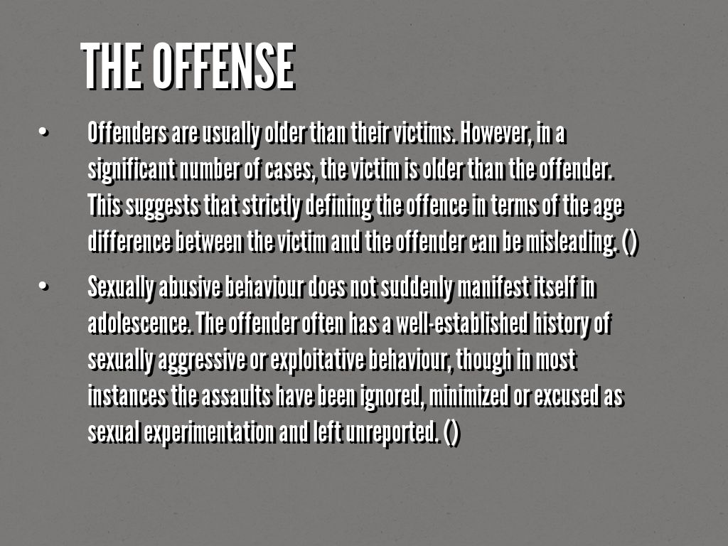 Offenders are usually older than their victims. However, in a significant number of cases, the victim is older than the offender. This suggests that strictly defining the offence in terms of the age difference between the victim and the offender can be misleading. ()
