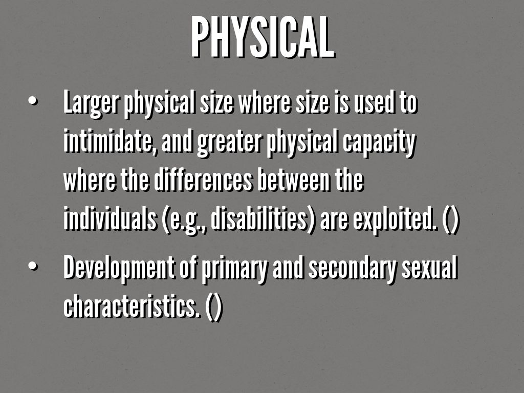 Larger physical size where size is used to intimidate, and greater physical capacity where the differences between the individuals (e.g., disabilities) are exploited. ()