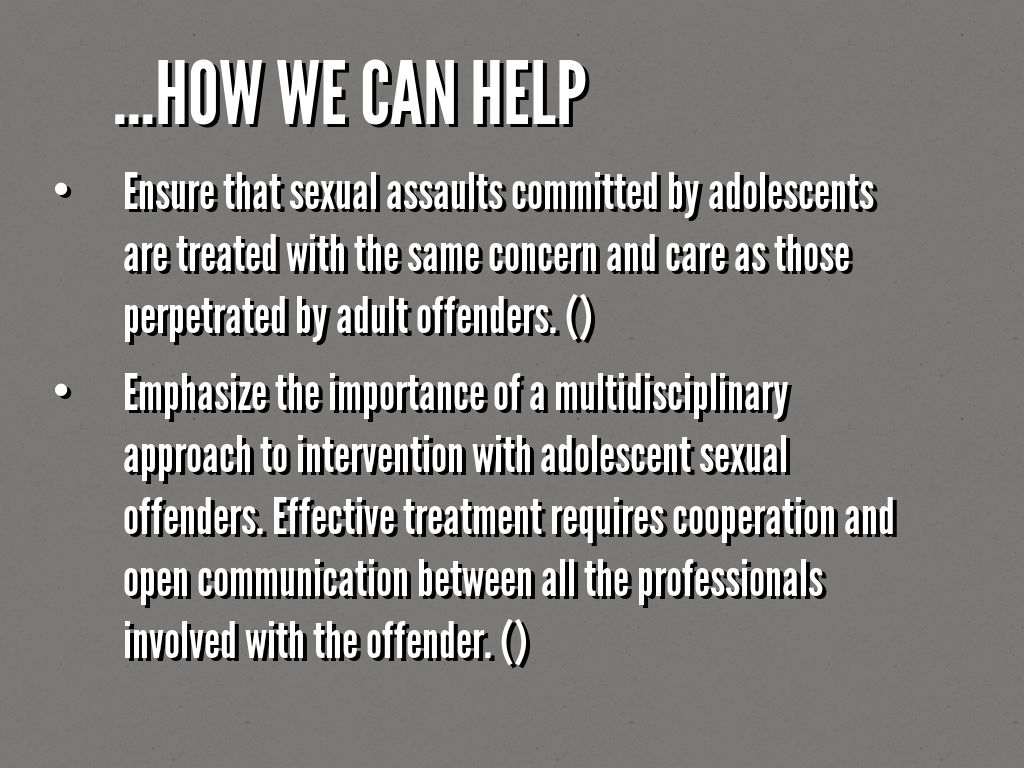Ensure that sexual assaults committed by adolescents are treated with the same concern and care as those perpetrated by adult offenders. ()