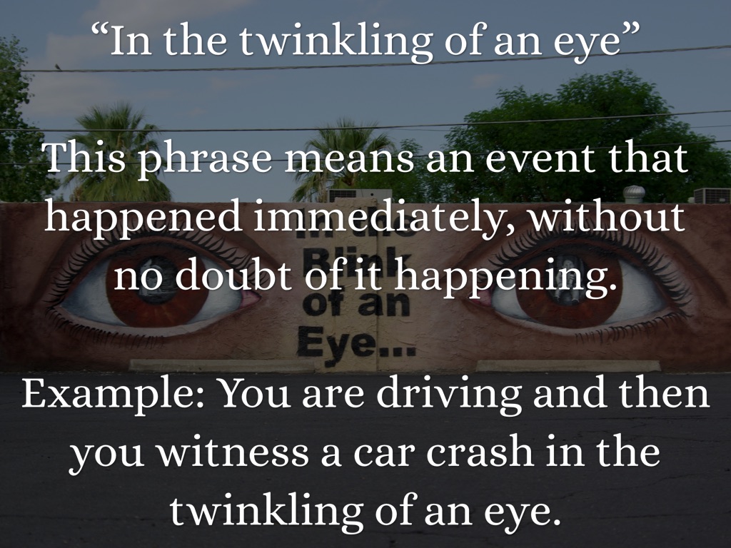 Example: You are driving and then you witness a car crash in the twinkling of an eye.