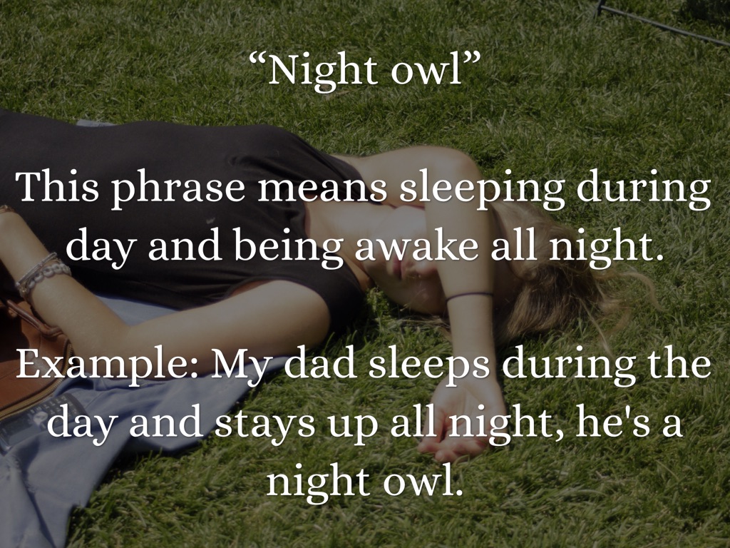Example: My dad sleeps during the day and stays up all night, he's a night owl.