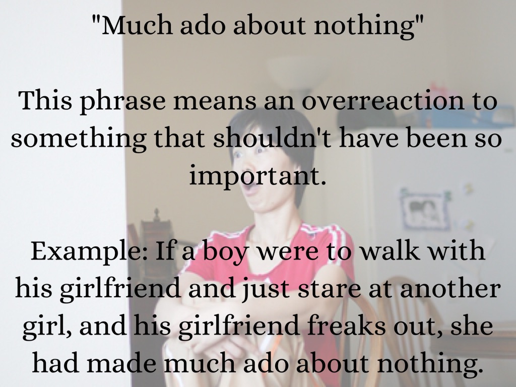 Example: If a boy were to walk with his girlfriend and just stare at another girl, and his girlfriend freaks out, she had made much ado about nothing.
