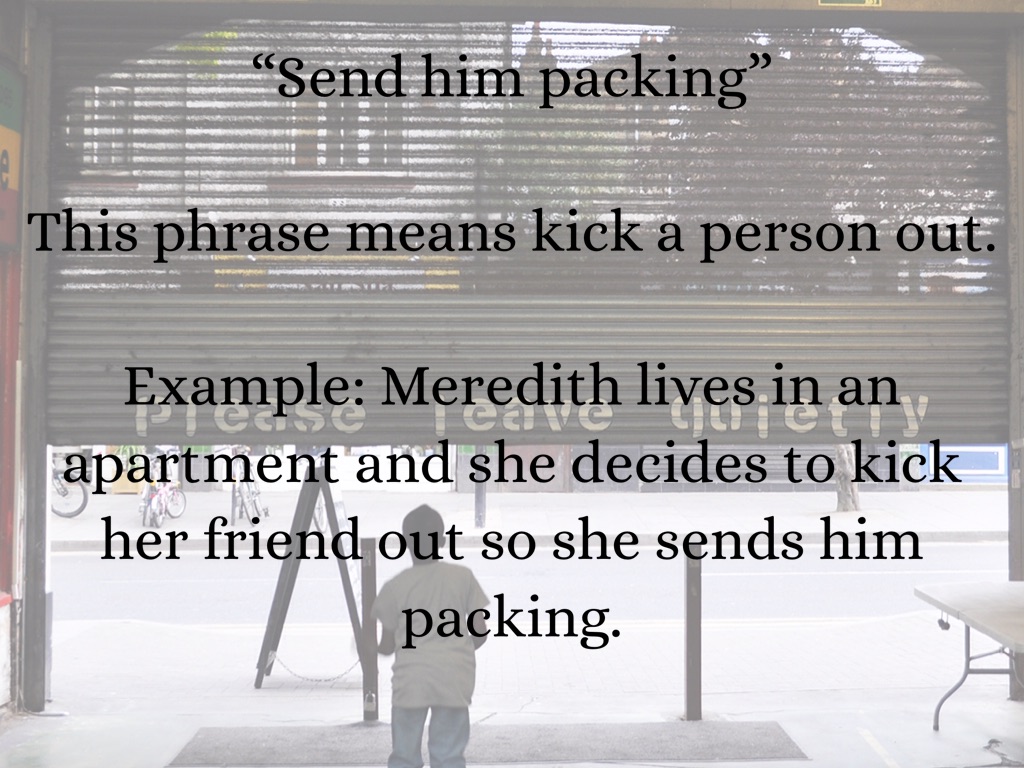Example: Meredith lives in an apartment and she decides to kick her friend out so she sends him packing.