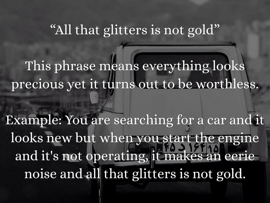 Example: You are searching for a car and it looks new but when you start the engine and it's not operating, it makes an eerie noise and all that glitters is not gold.