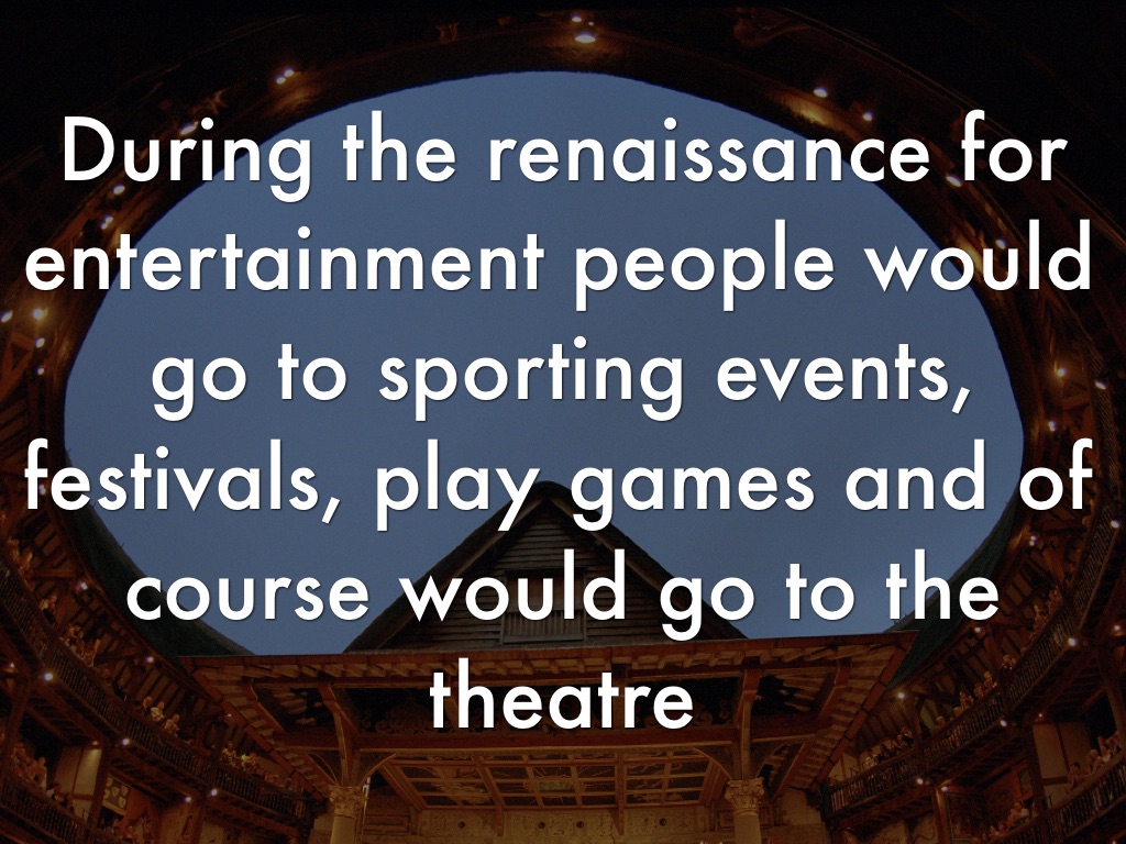 During the renaissance for entertainment people would go to sporting events, festivals, play games and of course would go to the theatre