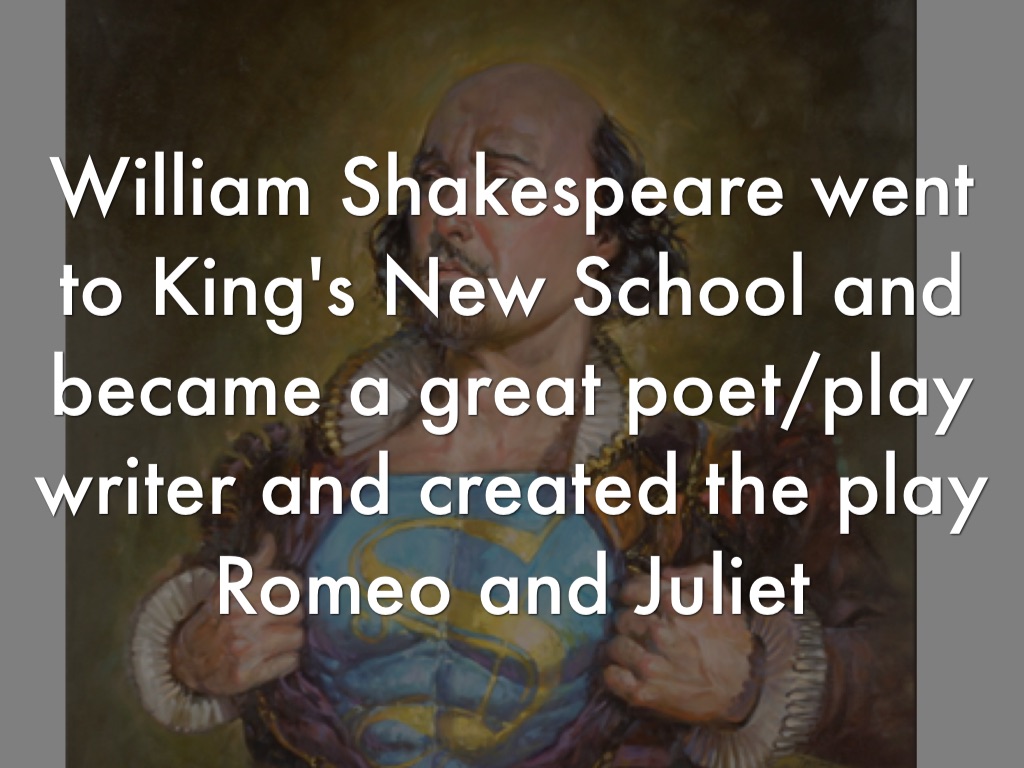 William Shakespeare went to King's New School and became a great poet/play writer and created the play Romeo and Juliet