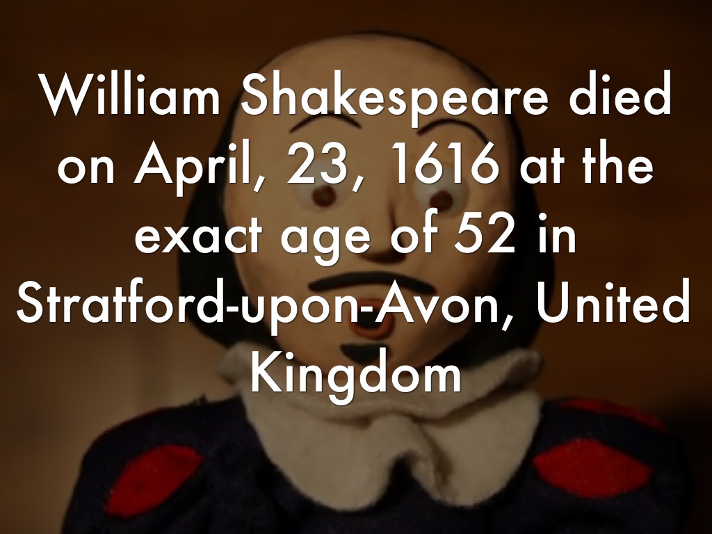 William Shakespeare died on April, 23, 1616 at the exact age of 52 in Stratford-upon-Avon, United Kingdom