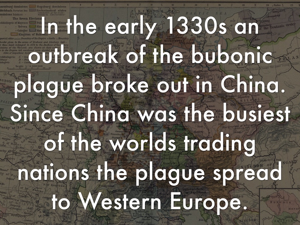 In the early 1330s an outbreak of the bubonic plague broke out in China. Since China was the busiest of the worlds trading nations the plague spread to Western Europe.