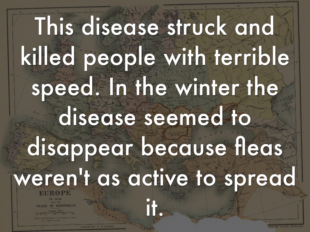 This disease struck and killed people with terrible speed. In the winter the disease seemed to disappear because fleas weren't as active to spread it.