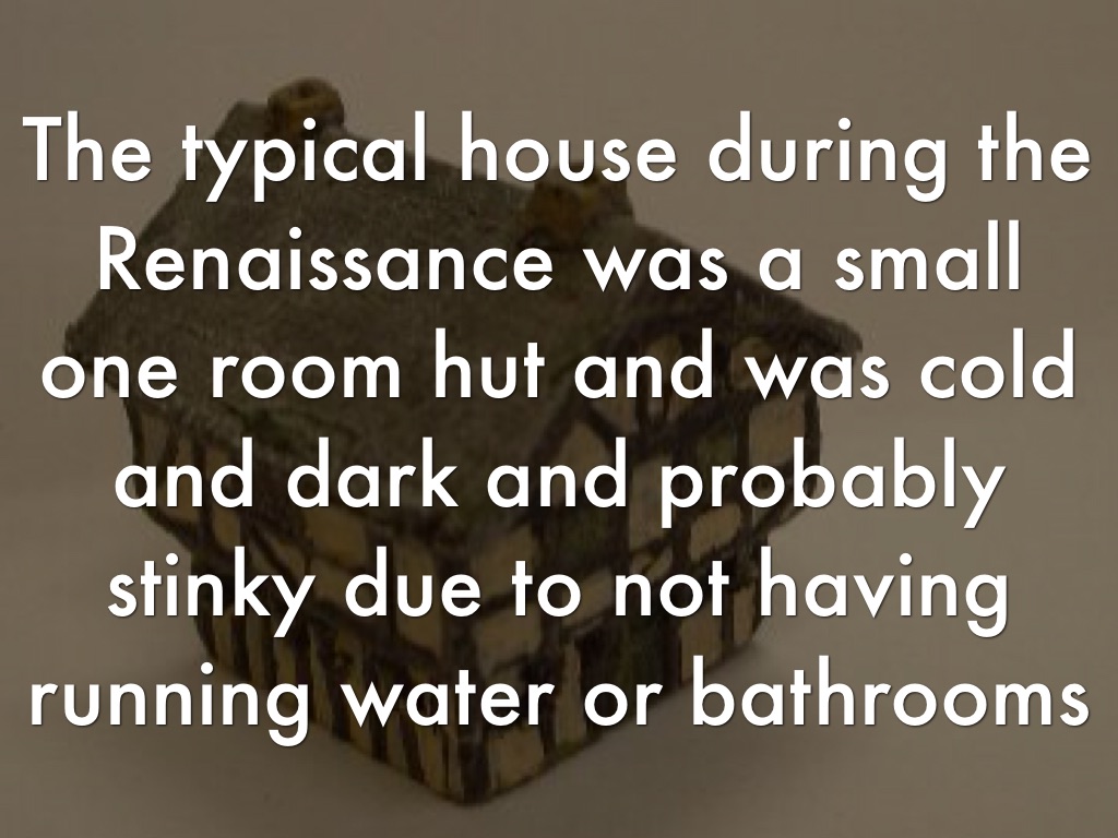 The typical house during the Renaissance was a small one room hut and was cold and dark and probably stinky due to not having running water or bathrooms