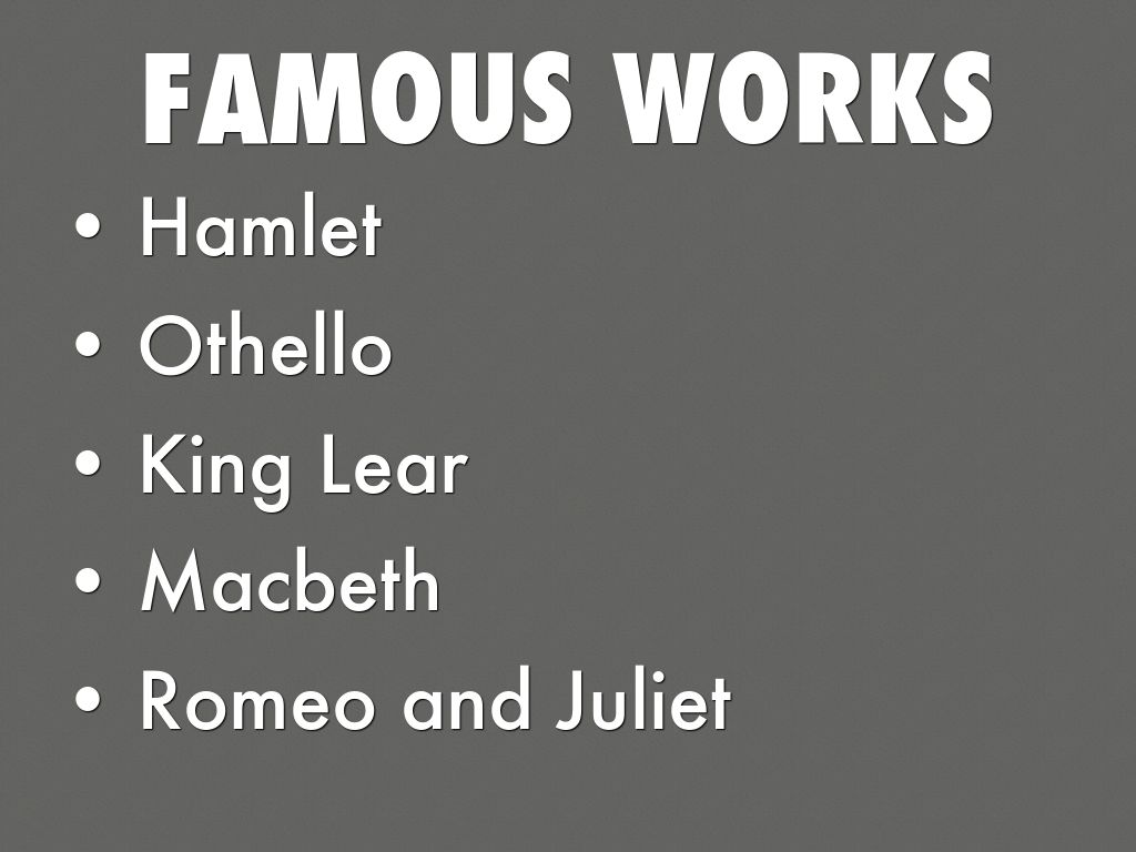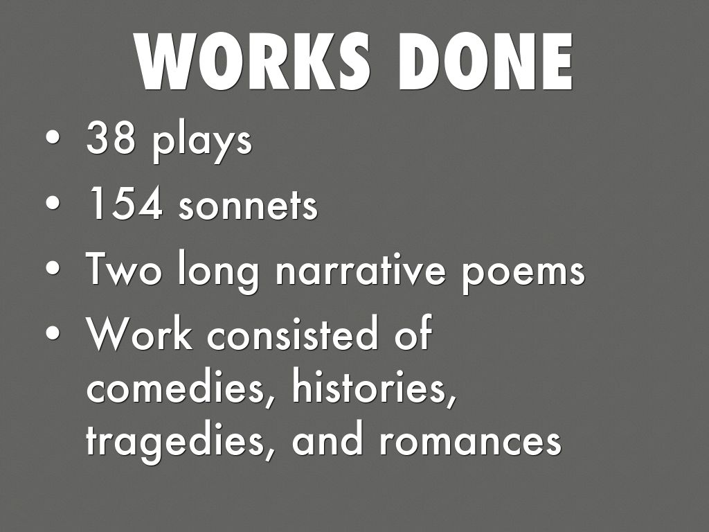 Work consisted of comedies, histories, tragedies, and romances
