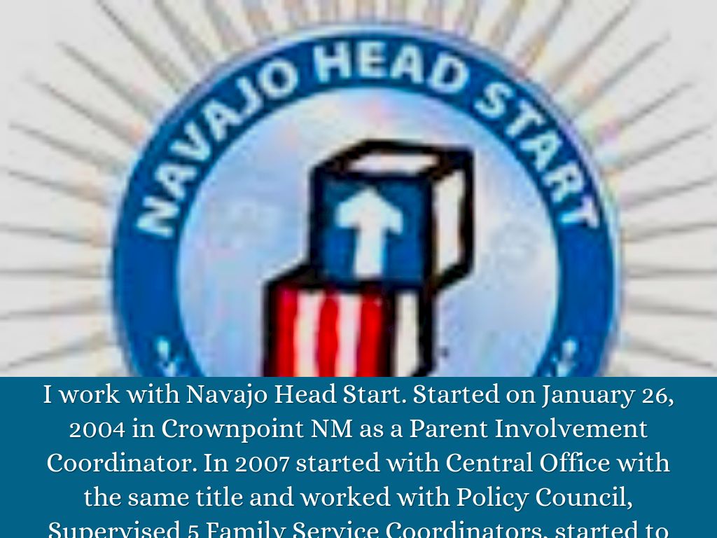 I work with Navajo Head Start. Started on January 26, 2004 in Crownpoint NM as a Parent Involvement Coordinator. In 2007 started with Central Office with the same title and worked with Policy Council, Supervised 5 Family Service Coordinators, started to work with ERSEA, Family Services, compiling PIR, reporting to OHS of enrollment numbers and other management duties. Today, I am an ERSEA/FE Liaison and delegated with ERSEA/FE Specialist duties. I also worked on Child Plus Student Database in development which holds 3000 + children along with colleague Rena Ben.
