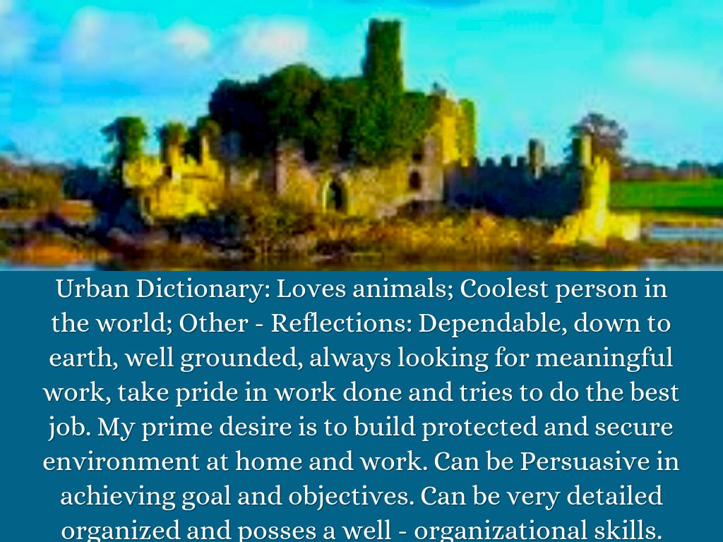Urban Dictionary: Loves animals; Coolest person in the world; Other - Reflections: Dependable, down to earth, well grounded, always looking for meaningful work, take pride in work done and tries to do the best job. My prime desire is to build protected and secure environment at home and work. Can be Persuasive in achieving goal and objectives. Can be very detailed organized and posses a well - organizational skills.