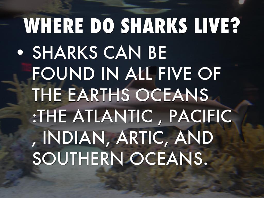 SHARKS CAN BE FOUND IN ALL FIVE OF THE EARTHS OCEANS :THE ATLANTIC , PACIFIC , INDIAN, ARTIC, AND SOUTHERN OCEANS.