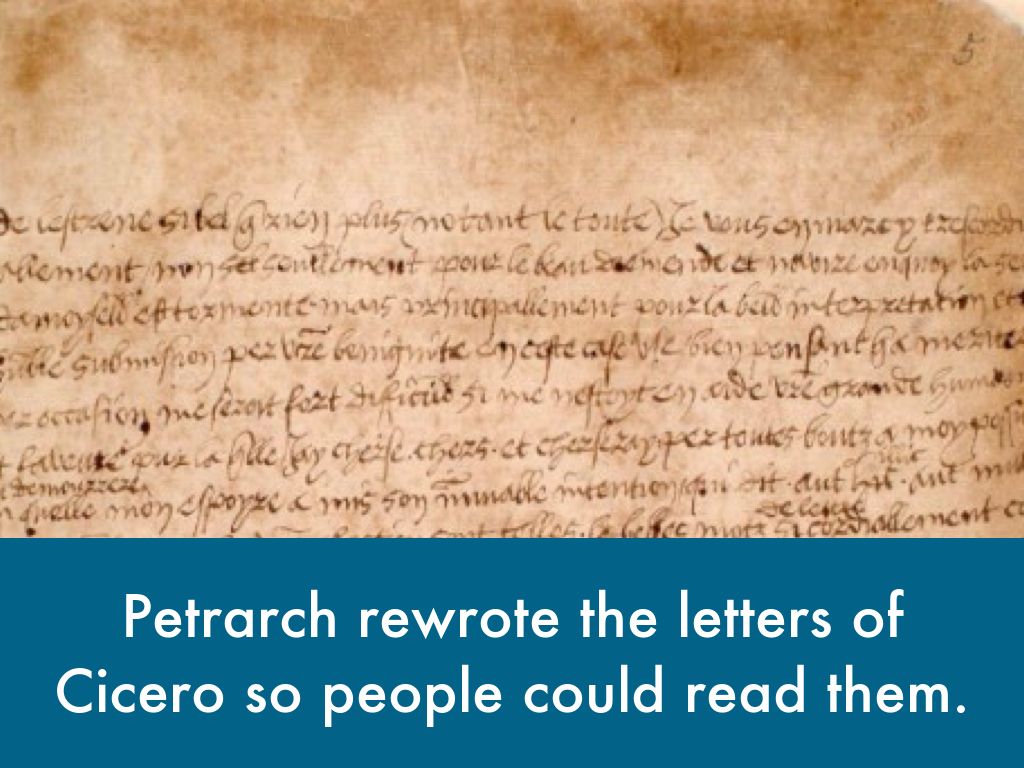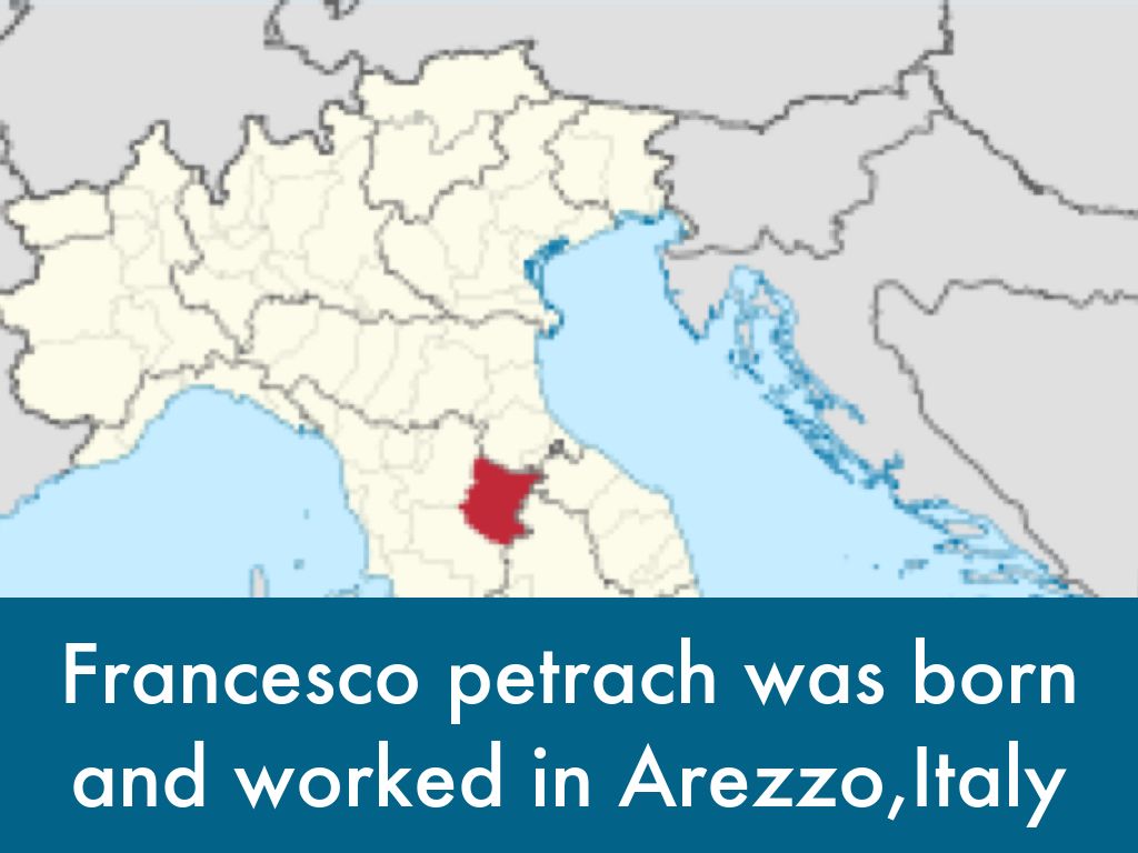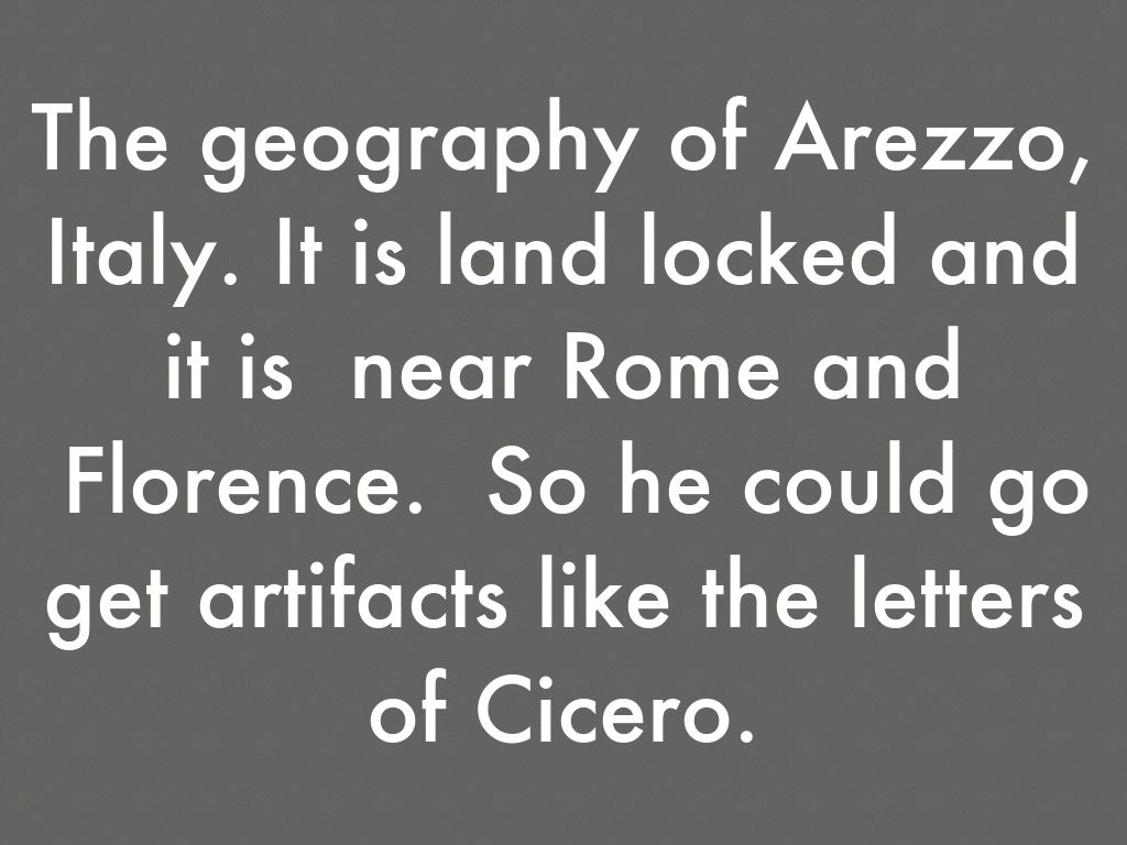 The geography of Arezzo, Italy. It is land locked and it is near Rome and Florence. So he could go get artifacts like the letters of Cicero.