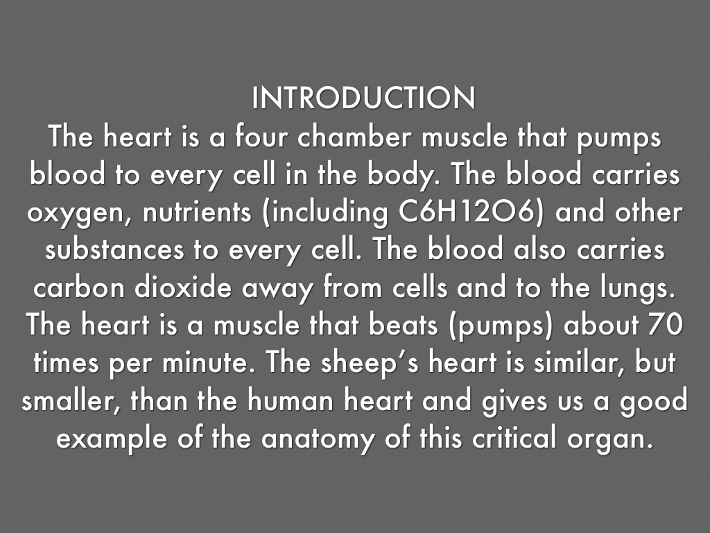The heart is a four chamber muscle that pumps blood to every cell in the body. The blood carries oxygen, nutrients (including C6H12O6) and other substances to every cell. The blood also carries carbon dioxide away from cells and to the lungs. The heart is a muscle that beats (pumps) about 70 times per minute. The sheep’s heart is similar, but smaller, than the human heart and gives us a good example of the anatomy of this critical organ.