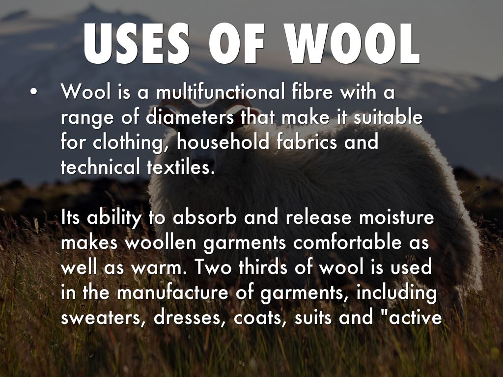 Slightly less than a third of wool goes into the manufacture of blankets anti-static and noise-absorbing carpets, and durable upholstery (wool's inherent resistance to flame and heat makes it one of the safest of all household textiles).
