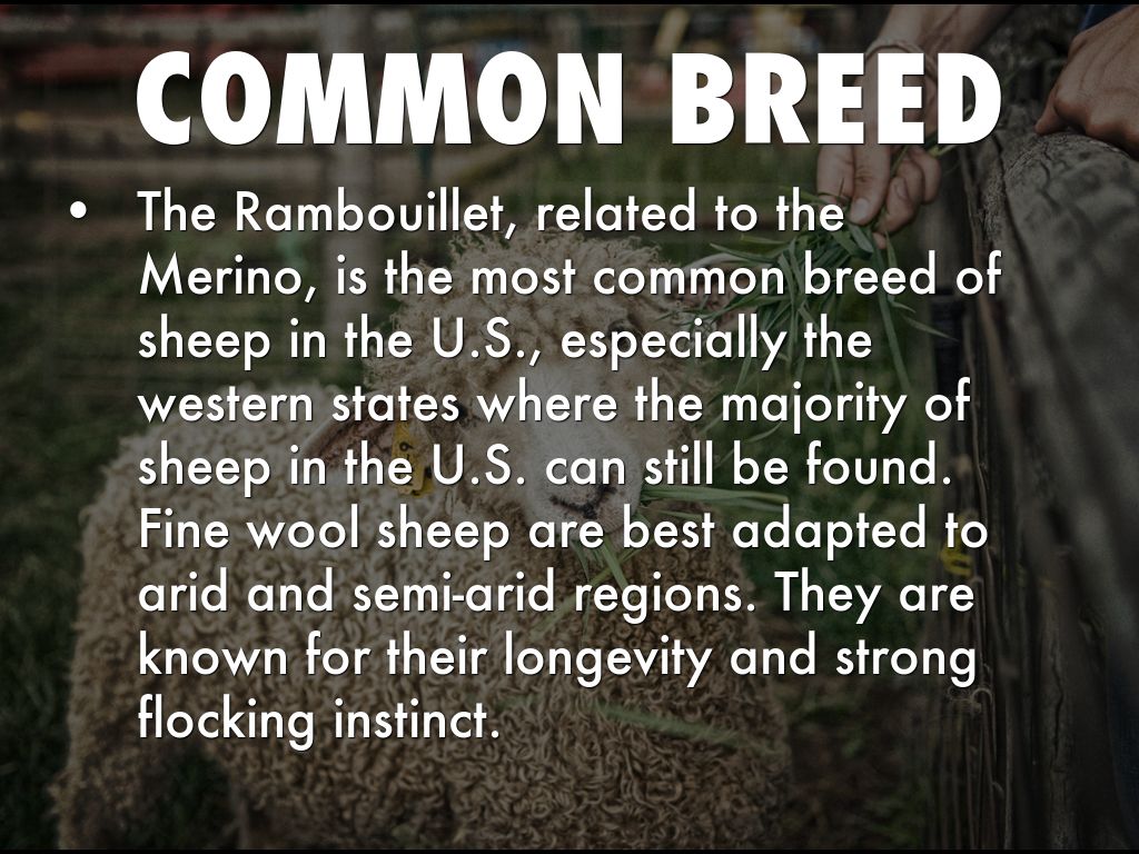 The Rambouillet, related to the Merino, is the most common breed of sheep in the U.S., especially the western states where the majority of sheep in the U.S. can still be found. Fine wool sheep are best adapted to arid and semi-arid regions. They are known for their longevity and strong flocking instinct.