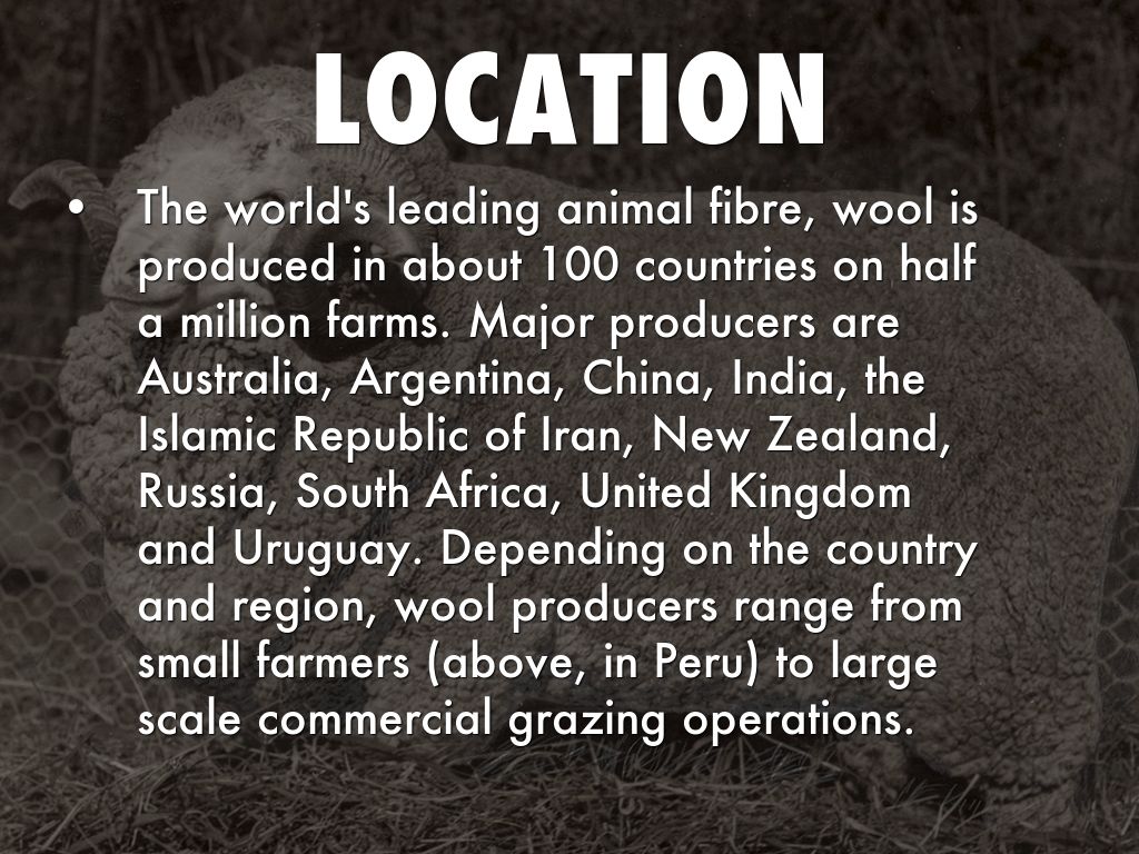 The world's leading animal fibre, wool is produced in about 100 countries on half a million farms. Major producers are Australia, Argentina, China, India, the Islamic Republic of Iran, New Zealand, Russia, South Africa, United Kingdom and Uruguay. Depending on the country and region, wool producers range from small farmers (above, in Peru) to large scale commercial grazing operations.