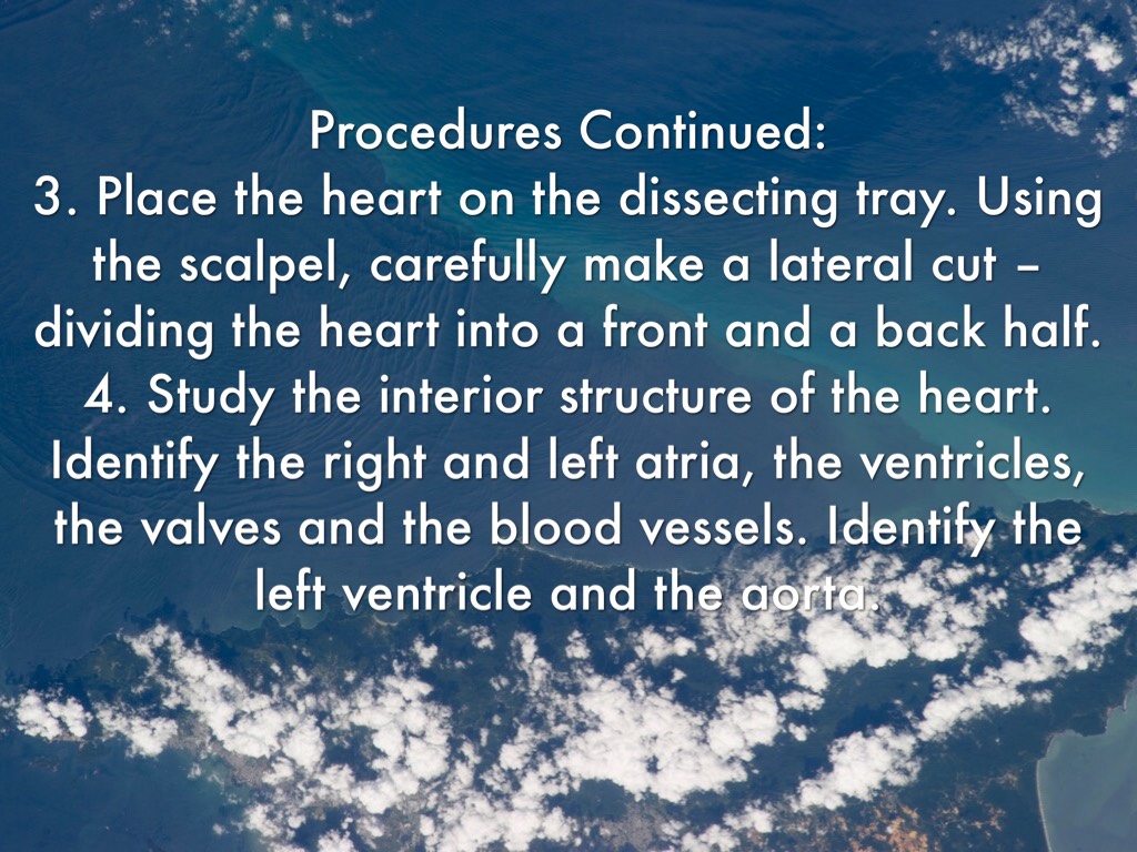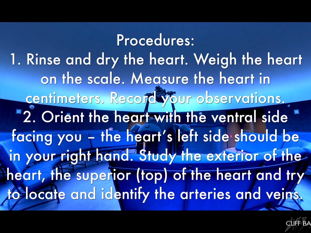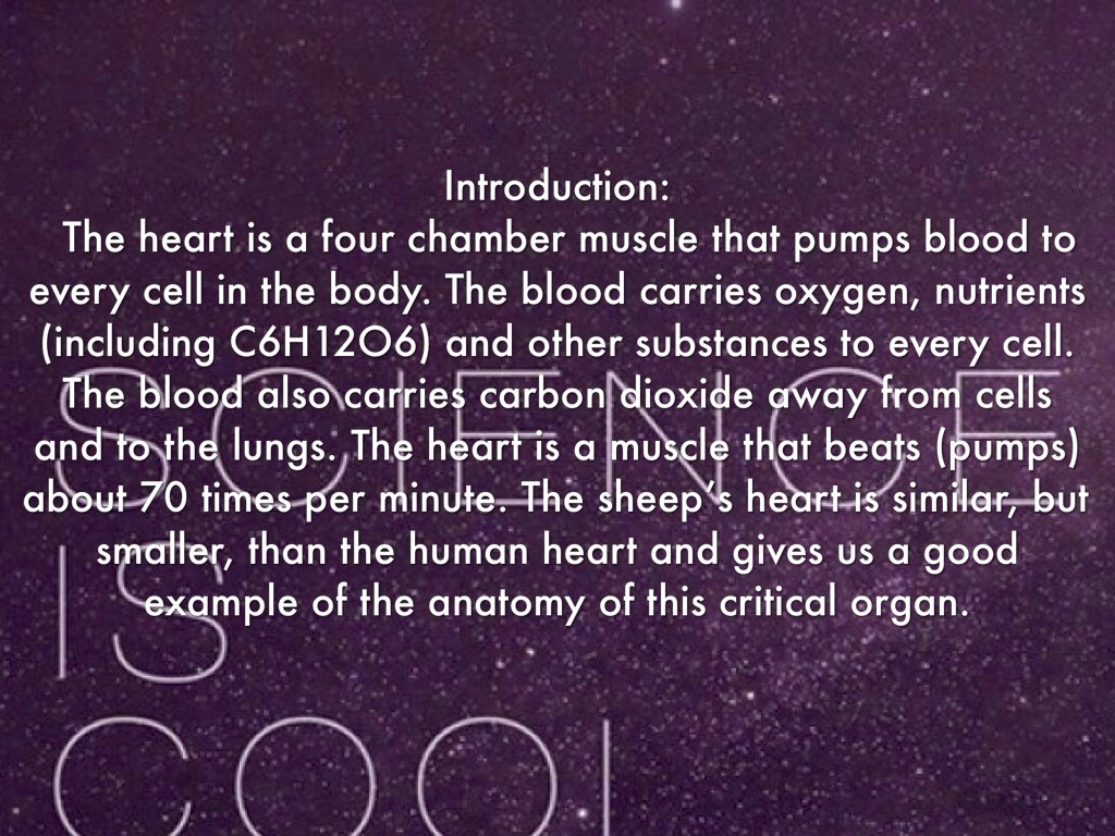 The heart is a four chamber muscle that pumps blood to every cell in the body. The blood carries oxygen, nutrients (including C6H12O6) and other substances to every cell. The blood also carries carbon dioxide away from cells and to the lungs. The heart is a muscle that beats (pumps) about 70 times per minute. The sheep’s heart is similar, but smaller, than the human heart and gives us a good example of the anatomy of this critical organ.