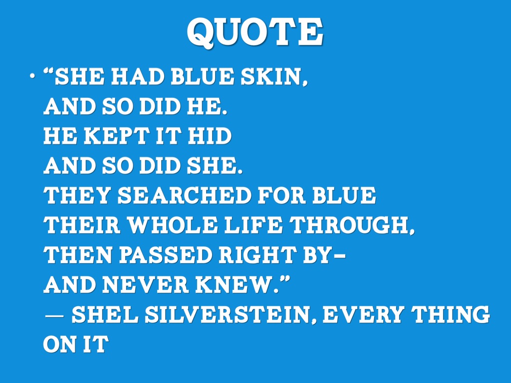 • “She had blue skin, And so did he. He kept it hid And so did she. They searched for blue Their whole life through, Then passed right by- And never knew.” ― Shel Silverstein, Every Thing on It