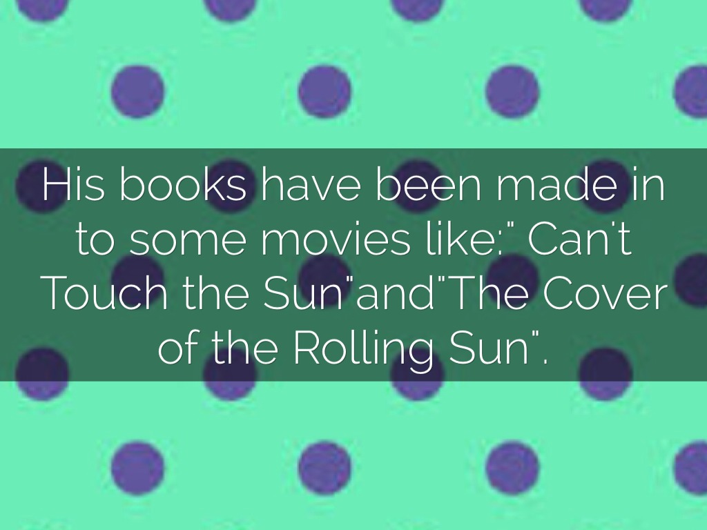 His books have been made in to some movies like:" Can't Touch the Sun"and"The Cover of the Rolling Sun".