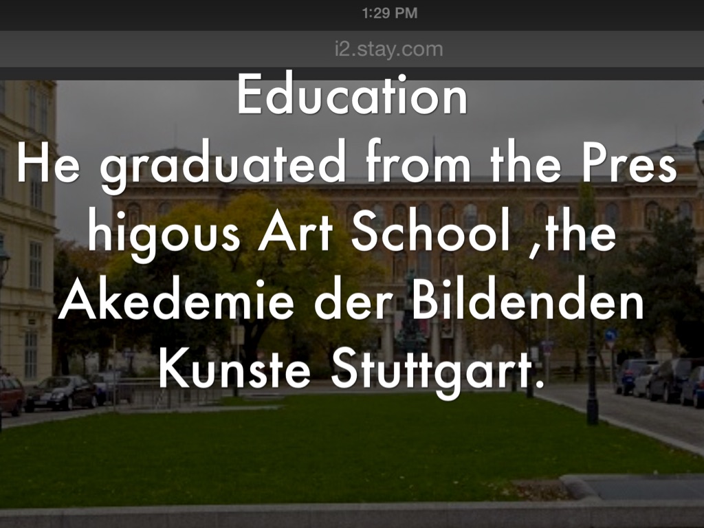 He graduated from the Pres higous Art School ,the Akedemie der Bildenden Kunste Stuttgart.
