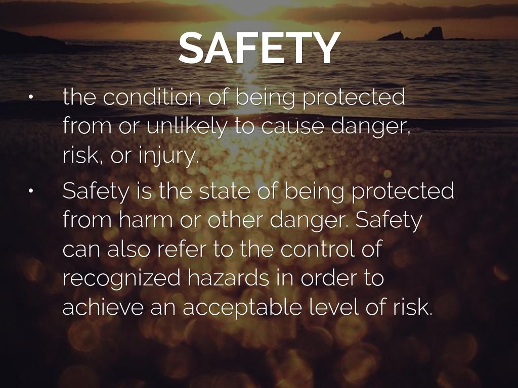 Safety is the state of being protected from harm or other danger. Safety can also refer to the control of recognized hazards in order to achieve an acceptable level of risk.