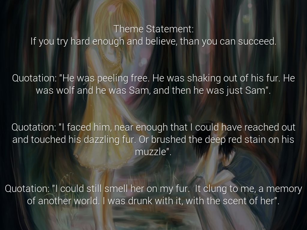 Explanation: In this quotation it is talking about how Grace finally got Sam out of the wolf form, not for long but at least he managed to get out. This happened because Grace believed that Sam could get out of the wolf skin.