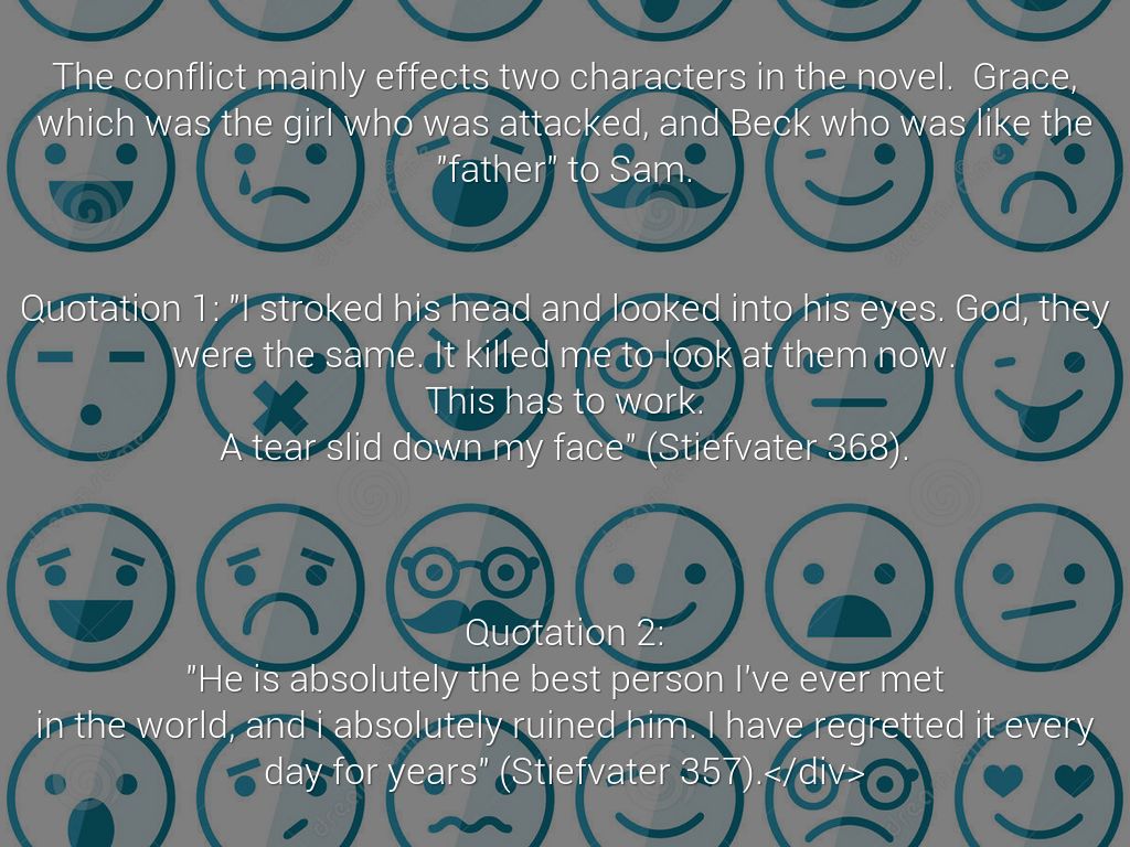 The conflict mainly effects two characters in the novel. The first would be Grace, it changed her emotions a lot throughout the story. She would be sad when Sam was a wolf and happy when he was human. He changed a lot through out the story, so it played with Grace's emotions. Grace becomes more stable in a way that she knows now that he can change any time and now she knows how to prevent him from changing states. The second character it affected was Beck, because he wanted Sam to be human because that was Beck's last year so he wanted to spend it with Sam, in human form.