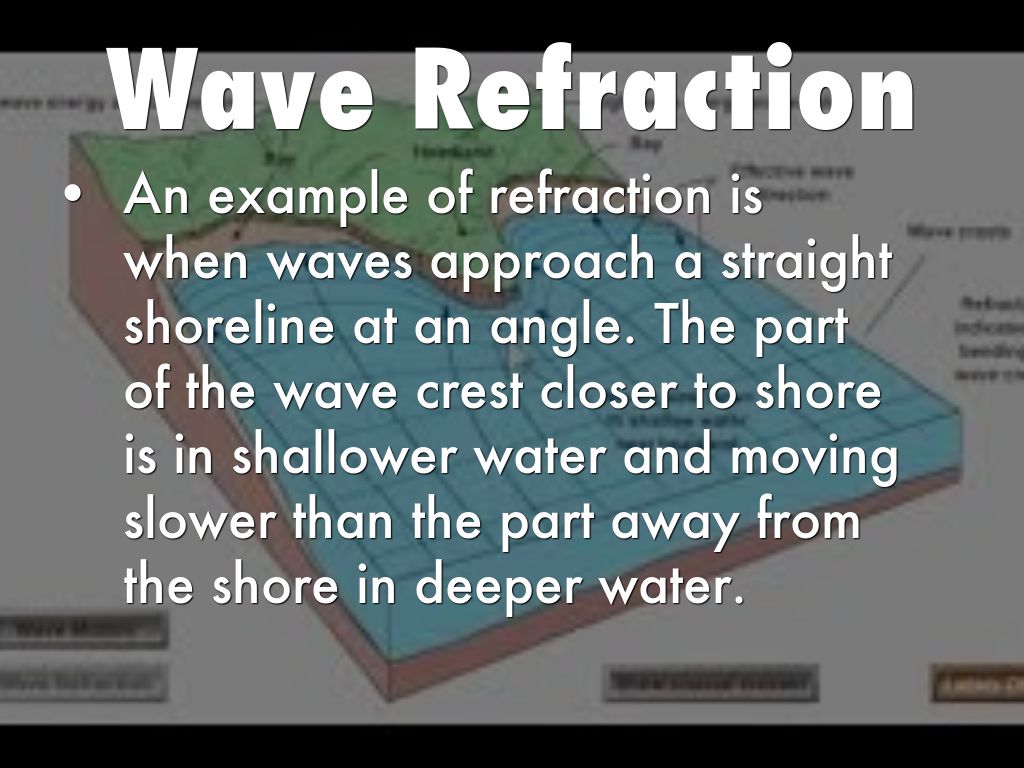 An example of refraction is when waves approach a straight shoreline at an angle. The part of the wave crest closer to shore is in shallower water and moving slower than the part away from the shore in deeper water.