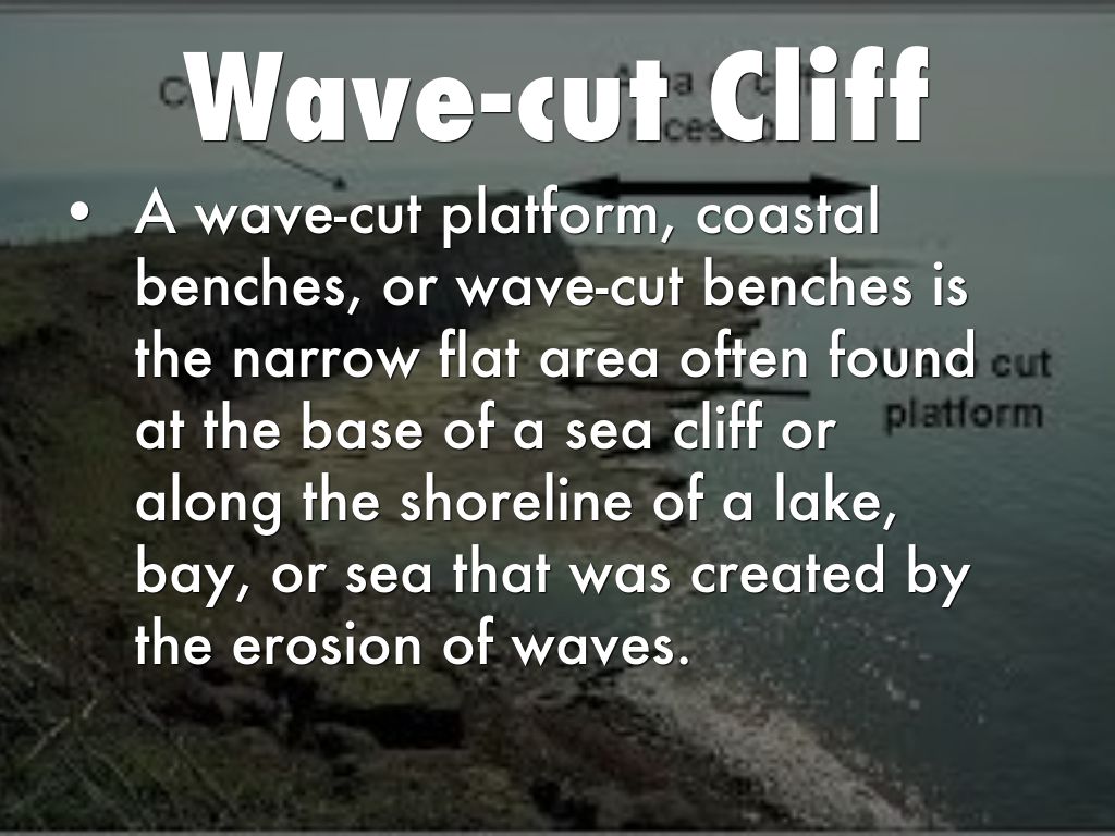 A wave-cut platform, coastal benches, or wave-cut benches is the narrow flat area often found at the base of a sea cliff or along the shoreline of a lake, bay, or sea that was created by the erosion of waves.