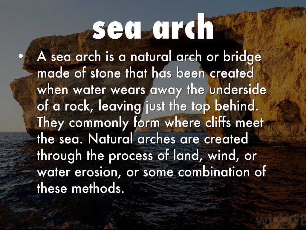 A sea arch is a natural arch or bridge made of stone that has been created when water wears away the underside of a rock, leaving just the top behind. They commonly form where cliffs meet the sea. Natural arches are created through the process of land, wind, or water erosion, or some combination of these methods.