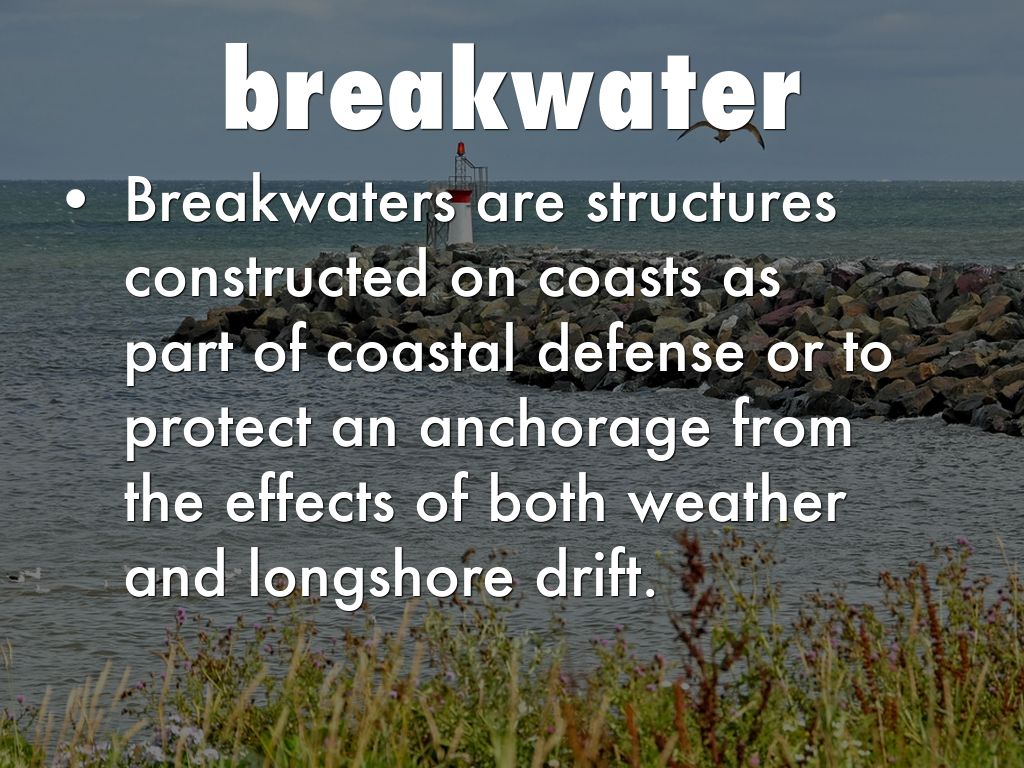 Breakwaters are structures constructed on coasts as part of coastal defense or to protect an anchorage from the effects of both weather and longshore drift.