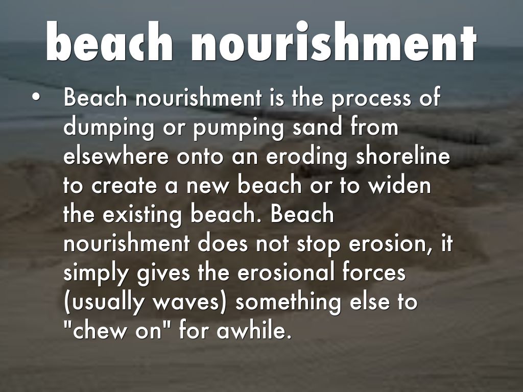 Beach nourishment is the process of dumping or pumping sand from elsewhere onto an eroding shoreline to create a new beach or to widen the existing beach. Beach nourishment does not stop erosion, it simply gives the erosional forces (usually waves) something else to "chew on" for awhile.