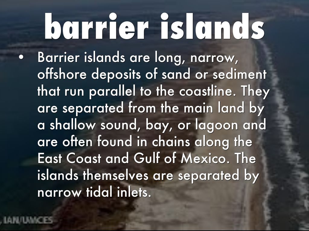 Barrier islands are long, narrow, offshore deposits of sand or sediment that run parallel to the coastline. They are separated from the main land by a shallow sound, bay, or lagoon and are often found in chains along the East Coast and Gulf of Mexico. The islands themselves are separated by narrow tidal inlets.