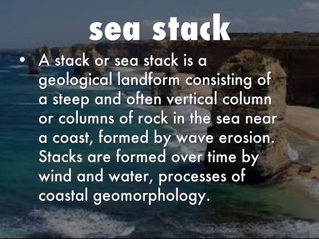 A stack or sea stack is a geological landform consisting of a steep and often vertical column or columns of rock in the sea near a coast, formed by wave erosion. Stacks are formed over time by wind and water, processes of coastal geomorphology.
