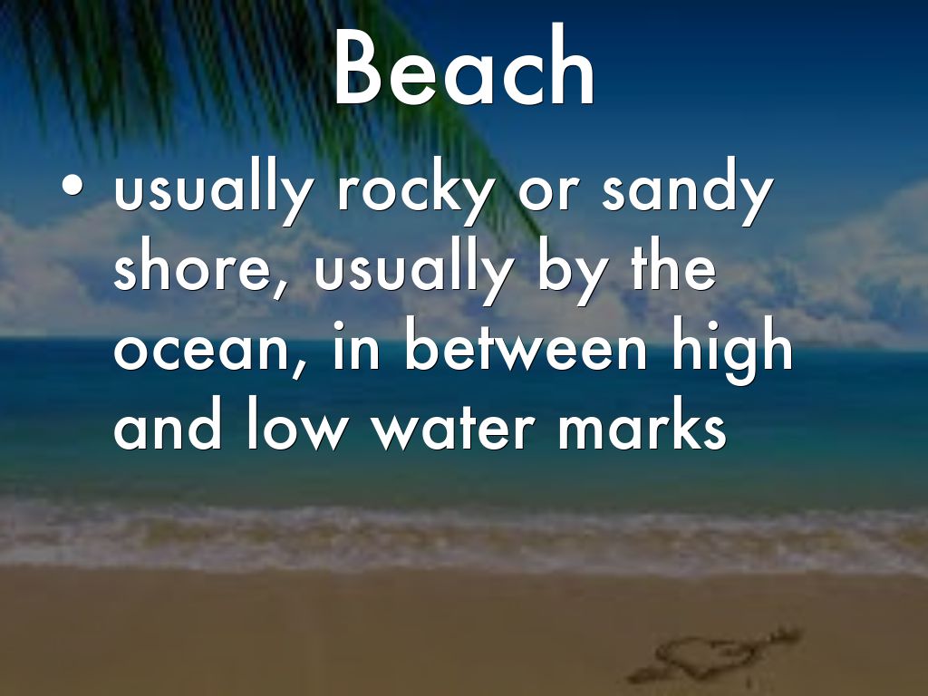 usually rocky or sandy shore, usually by the ocean, in between high and low water marks