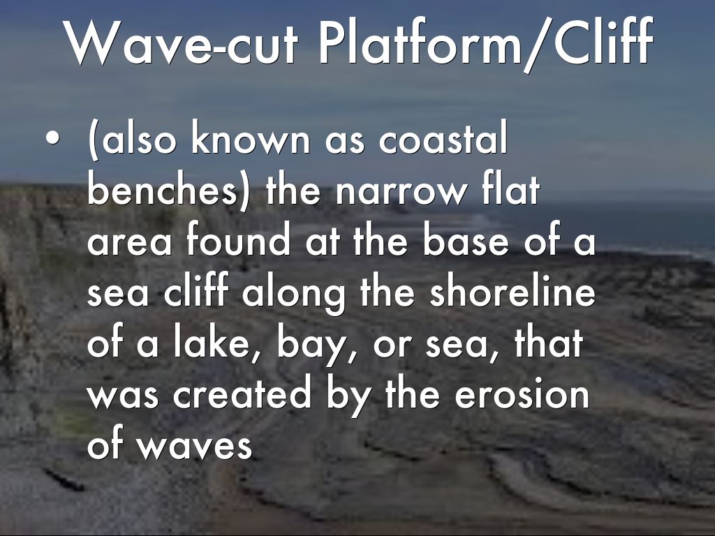 (also known as coastal benches) the narrow flat area found at the base of a sea cliff along the shoreline of a lake, bay, or sea, that was created by the erosion of waves