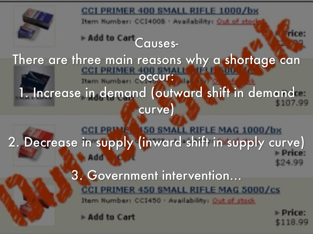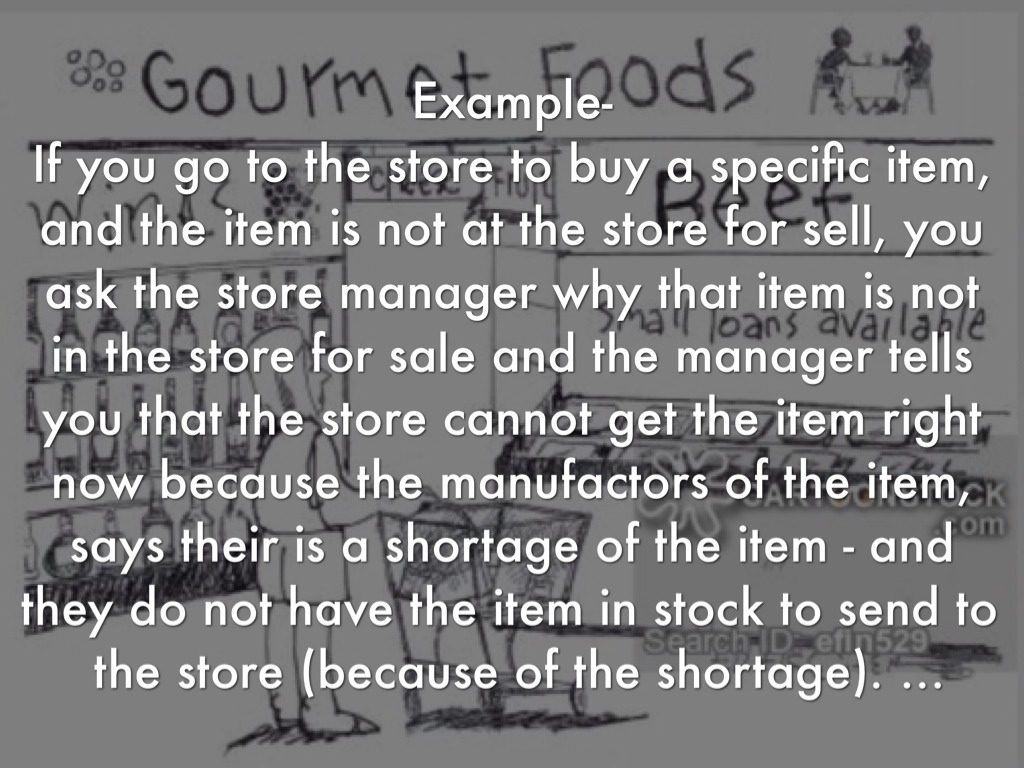 If you go to the store to buy a specific item, and the item is not at the store for sell, you ask the store manager why that item is not in the store for sale and the manager tells you that the store cannot get the item right now because the manufactors of the item, says their is a shortage of the item - and they do not have the item in stock to send to the store (because of the shortage).